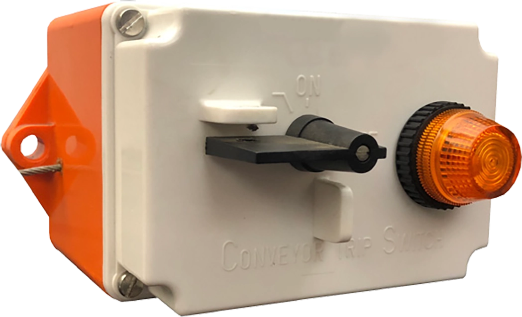 The CTS 200L uses an electrical rotary switch, allowing personnel to trip it manually. The electrical switch is a self-wiping rotary switch (not a micro switch), and consists of two normally open and two normally closed contacts. Once tripped, the Blue colored flag is in the “Up” position the light is illuminated (making it visible to maintenance personnel). It must then be manually reset in order to restart the conveyor.